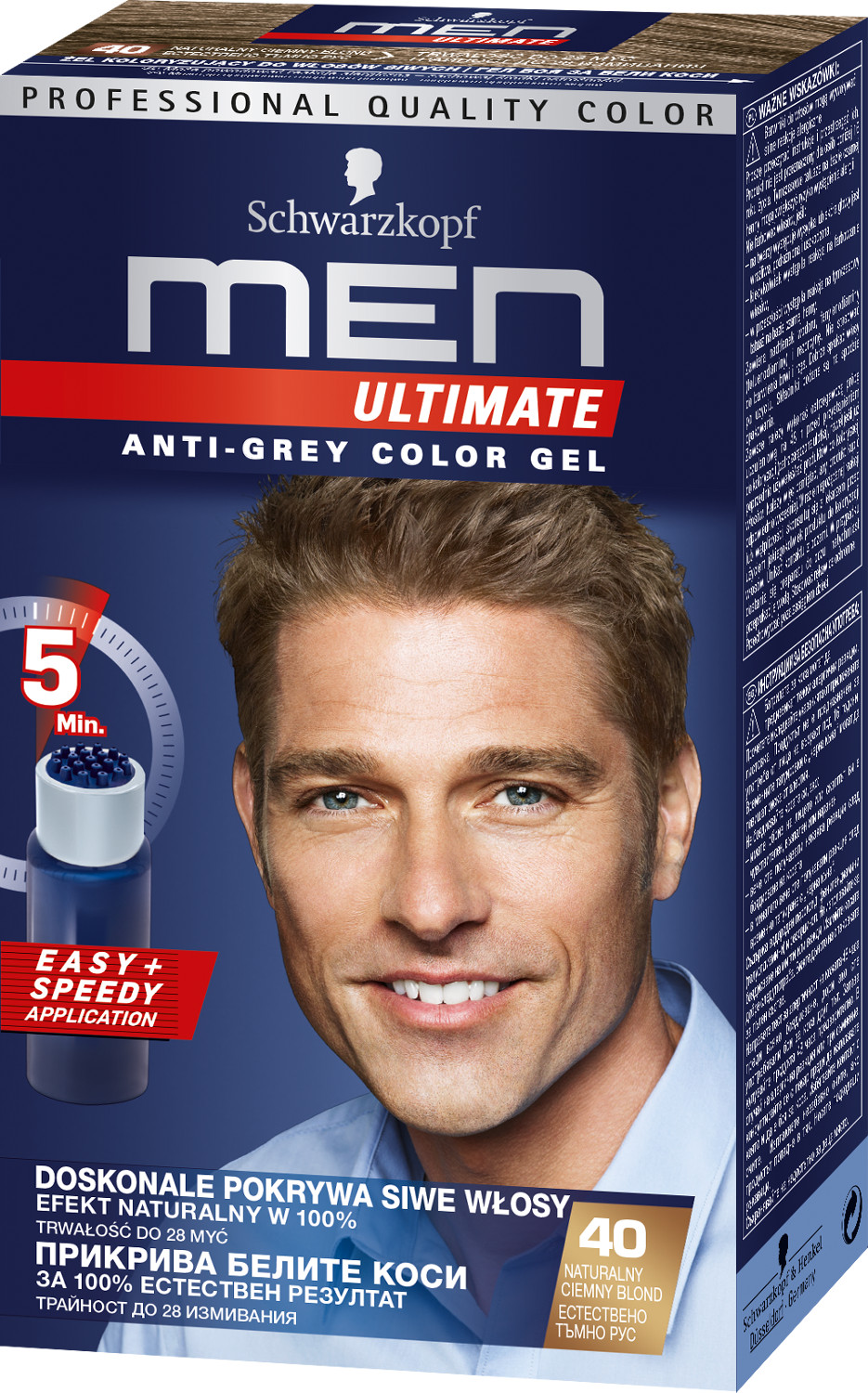 Специално създадена за мъже, боята за коса от "Schwarzkopf" осигурява дискретно покритие на прошарените и побелелите коси. Тя се нанася изключително лесно, благодарение на специален апликатор. С него просто сресвате в суха коса и готово. С боята получавате естествено изглеждащ цвят, само след 5 минути. Тя освежава цвета, едновременно с което подобрява здравината на косата. Енергизиращата ѝ формула съдържа минерален комплекс - морски минерали, които укрепват структурата на косъма. Боята има дълготраен ефект - издържа до 28 измивания. Върнете увереността и младежкия си дух със "Men Ultimate". Изберете подходящия за вас нюанс, според естествения ви цвят.