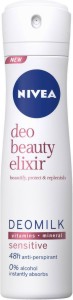 Nivea Deomilk Beauty Elixir SensitiveДамски дезодорант против изпотяване за чувствителна кожа от серията "Beauty Elixir"Цена за доставка за гр. София - 2.90 лв. Безплатна доставка за София при поръчка над 50 лв. За цена и срок извън гр. София кликни тук. Този дезодорант може да бъде доставен в дните: