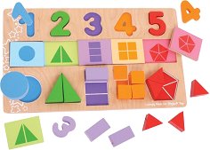 С комплекта от "Bigjigs Toys" детето ви ще се научи да разпознава цветове, форми и да брои до 5. Комплектът е изработен от дърво, боядисано с безвредни бои на водна основа и съдържа подложка за редене и фигури за сортиране. Цветовете, изобразени в комплекта, са син, зелен, лилав, оранжев и червен и всеки от тях съответства на конкретна фигура и число. С него детето ви ще бъде готово за училище неусетно докато се забавлява! Размерът на подложката за редене е 38.5 x 22.5 cm. ... |