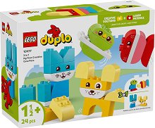 Конструкторът е част от серията LEGO Duplo, където може да намерите още интересни комплекти. ... С конструктора на LEGO децата ще се забавляват. С този комплект малките строители разполагат с 24 части, с които могат да изградят до 8 различни животни. Сред възможните модели са куче, котка, заек, птица, мишка и риба, както и още комбинации, създадени с въображение. Част от фигурките са изградени от едноцветни тухлички, което подпомага ученето чрез сортиране по цветове. Докато подбират правилните елементи и сглобяват своите домашни любимци, децата развиват фина моторика, концентрация, постоянство и логическо мислене. ... |