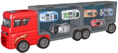 Големият детски автовоз пристига натоварен с шест уникални състезателни автомобила и безброй възможности за забавна игра. Той има два етажа, на които да бъдат натоварени колите. Горният етаж е подвижен и само с едно движение може да се разгъне и така автовозът да стане по-дълъг и на един етаж. Всяка от състезателните колички може да се закрепи стабилно върху него, за да не изпада. Автомобилите могат да се бутат самостоятелно и отделно от автовоза. Те са цветни и номерирани, така че децата да научат числата, както и да броят, докато играят. Когато е разпънат на един етаж, автовозът е с приблизителни дължина от 80 cm. ... |
