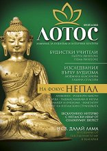 Алманахът "Лотос" ни запознава с историята, културата и традициите на родината на Буда - Непал, една спираща дъха страна, разположена сред осемхилядниците на Хималаите, рай както за алпинисти и трекери, така и за духовно търсещи хора и поклонници от цял свят. Наред с интересни материали за Катманду и будизма, за Падмасамбхава в Непал, за Лумбини и Бхактапур, за историческите земетресения в региона, за Матийо Рикар, ви представяме ексклузивно интервю с живеещия в областта Солукхумбу непалски лекар д-р Лхакпа Нгодуп, племенник на големия будистки учител Науанг Тензинг Зангбу - настоятел на манастира Тенгбоче в ... |