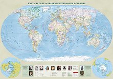 Характеристики: географска мрежа; държави, представени чрез държавни граници; владения на най-големите колониални държави; империи от Новия свят, завладени от испанците; хидрография; маршрути, години и предводители на по-важни португалски, испански, британски, нидерландски, френски и руски експедиции; линии на колониално разделение между Испания и Португалия според договорите от Тордесиляс и Сарагоса; места на смърт на пътешественици; столици и градове; надписи на хидрография, държави, континенти, племена и други; легенда. Картата е двустранно ламинирана. Изработена е от винил с пластмасови лайсни в долния ... |
