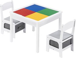 Комплектът на GINGER HOME се състои от 2 дървени столчета и масичка, които са чудесно допълнение към всяка детска стая. Масата има двустранен подвижен плот, а под нея е предвидено място за съхранение на материали за рисуване или дребни играчки. Едната страна на плота е с гладка повърхност, която детето може да ползва за игра, рисуване или хранене. Другата повърхност на плота представлява подложка за редене на конструктор. Столовете имат удобни облегалки, а под седалките им са разположени подвижни текстилни кутии за играчки. Размерите на мебелите са съобразени, така че да са удобни за използване от деца над 3 години. Те ... |