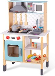 Малкият човек ще се превърне в истински майстор готвач с детската кухня. Тя разполага с 2 котлона, мивка, рафтове, хладилник, абсорбатор, отцедник за съдове, печка, тенджера, тиган, хранителни продукти и прибори. Хранителните продукти включват мляко, скарида, наденички, пържено яйце, пиперница, захарница с капак и други. Приборите са лъжици, черпак, шпатула и ножици. Те могат да се закачат върху кукички. Мивката има кран, от който може да тече вода чрез натискане на помпа. Абсорбаторът разполага с 4 светещи бутона и лампа. Бутоните са за включване и изключване на музика, за регулиране на силата на звука, за включване на ... |