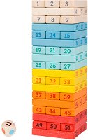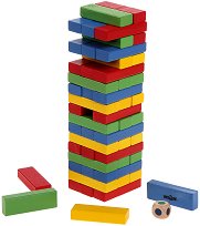 Класическата разноцветна "Дженга" от "Lelin Toys" се състои от 55 дървени блокчета и зарче със същите цветове. Играе се лесно - първо се подреждат блокчетата по цветове едно над друго по три, като във всеки ред елементите трябва да са перпендикулярни на предния. След това играчите се редуват да хвърлят зарчето и да извадят внимателно блокче със същия цвят и да го сложат най-отгоре. Целта на играта е кулата да се построи колкото се може по-висока. Губи играчът, който я бутне. Дървените блокчета са с приблизителни размери 7.5 / 1.5 / 2.5 cm и са 55 елемента - за играта са нужни 54, но комплектът ... |