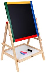 Забавлявайте се заедно с вашите малчугани! Играйте с тях, научете ги да рисуват, да пишат и да смятат! Двустранната дъска за писане от "Woodyland" ви позволява всичко това. Едната ѝ страна е черна и е подходяща за писане с тебешири. Другата страна на дъската е бяла и е предназначена за писане с маркери. Можете да се възползвате и от качествата ѝ на магнитна дъска, като подреждате върху нея шарени магнити. В горната си част, дъската има ролка с хартия, като флипчарт, с помощта на която децата ще могат по-лесно да творят с моливи, пастели или флумастери. Дъската разполага също и с шарено сметало, ... |