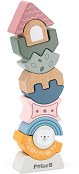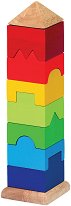 Дървена играчка за нанизване с цветни блокчета в различни форми. Релефът на фигурите е уникален и те си пасват две по две. Всичките 9 елемента в комплекта са от дърво, със заоблени ръбове за безопасна игра. От тях детето може да си "построи" цветна кула, нанизвайки фигурките последователно. Играчката развива въображението и логичното мислене на детето, като му помага да учи и цветовете. ... |