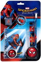 Ученически комплект от 6 елемента с любимия на много деца герой Спайдърмен от "Derform". Комплектът включва тефтерче, молив с гумичка, острилка, линийка, щипка и по-голяма гумичка. ... |