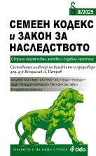 Съставител и автор на бележките: гл. ас. д-р Венцислав Л. Петров. Сборникът е актуализиран към 01.03.2025 г. ... Изданието включва: семеен кодекс (2009); семеен кодекс (1985); семеен кодекс (1968); закон за лицата и семейството (извлечение); закон за закрила на детето (извлечение); правилник за прилагане на Закона за закрила на детето (извлечение); закон за защита от домашното насилие; правилник за прилагане на Закона за защита от домашното насилие (извлечение); наредба за определяне на реда за изплащане от държавата на присъдена издръжка; граждански процесуален кодекс (извлечение); закон за наследството; ... |