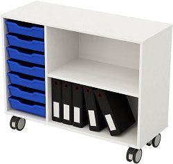 Органайзерът е подходящ за подреждане и съхранение на папки, класьори и всичко необходимо в работното ежедневие. Разполага с 2 рафта и колелца със стопери, които улесняват преместването и стабилното застопоряване. Към него са включени и 7 плитки кутии за съхранение на документи, листове, учебни помагала и пособия. Кутиите се изваждат чрез издърпване и всяка е с размери 31 / 37.5 / 7.5 cm. Шкафът е изработен от ПДЧ и е лесен за поддръжка и почистване. Намира практично приложение в училища, университети, библиотеки, офиси и други административни сгради. Характеристики: 7 пластмасови плитки кутии за съхранение 2 ...