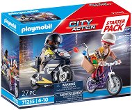 Конструкторът е от серията City Action, където ще откриете още продукти на темата. ... Децата ще се потопят в полицейски приключения с конструктора от Playmobil. Състоящ се от 27 части, комплектът включва 2 мини фигурки на полицай и крадец, мотоциклет, велосипед, каска с визьор, ръкавици и бижута. Малчуганите могат да пресъздадат вълнуващо полицейско преследване, помагайки на полицая да залови крадеца. Фигурките имат подвижни ръце и могат да се свиват в областта на таза. Всяка фигурка е с височина 7.5 cm. ...