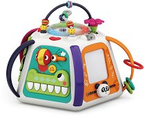 Активната пирамида от "Hola" предлага множество занимания за вашия мъник. Тя е изработена от пластмаса и с нея малчуганът не само ще се забавлява, но и ще развива своите умения. Играчката разполага със светлинни и звукови ефекти, които ще се харесат на детето. Докато играе с различните активности на пирамидата детето ще може да развие своя слух, координация, въображение, фина моторика, логическото мислене, ориентацията си между очи и ръце, както и причинно-следствена връзка. Играчката работи с 3 броя батерии 1.5V AA, които се закупуват отделно. Активни занимания Лабиринт-спирала - Върху спиралата са ... |