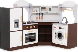 Дървената ъглова кухня за игра от Costway е чудесен начин да въведете детето си в света на готвенето и въображаемата игра. Тя е оборудвана с котлони със светлинни и звукови ефекти, микровълнова печка, ледогенератор с бутон за кубчета лед и множество реалистични функции, които гарантират часове забавление. Ъгловият дизайн позволява използване на пространството по най-ефективен начин и предоставя четири отделни игрови зони, което прави кухнята подходяща дори за съвместна игра на няколко деца. Комплектът включва сладки аксесоари като шапка на готвач, престилка, прибори и съдове за готвене. Пространствата за съхранение – ... |
