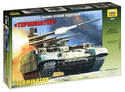 Умален модел на руска боева машина за поддръжка на пехотата - "БМПТ" "Терминатор". Дължина на модела 20.20 cm. "БМПТ" "Терминатор" е машина, предназначена за водене на военни действия в редиците на бронетанковите части и оказване на непосредствена огнева поддръжка на бойното поле. Машината е предназначена за борба с пехота, хеликоптери и леко бронирана техника, представляващи заплаха за танкове в хода на битката. "БМПТ" представлява реализация на една алтернативна концепция за организацията на танковите части при провеждане на операции. Тя трябва да замени мотострелковия ... |