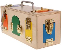 Дървеното сандъче е разделено на 3 секции, като в горната част и 4-те му страни са изрязани 10 отвора. Всеки отвор има цветна вратичка, която е захваната за кутията с подвижна панта. Вратичките се заключват по определен начин. Някои са с резе, райбер или катинар. Заниманията с играчката имат за цел да развият фината моторика и сръчността на детските ръце. Освен това спомага за развиването на логическото мислене, съобразителността, вниманието и търпението. Сандъчето е с приблизителна дължина 34 cm. За метода на Монтесори Революционен образователен метод - така би звучало най-краткото обяснения на подхода " ... |