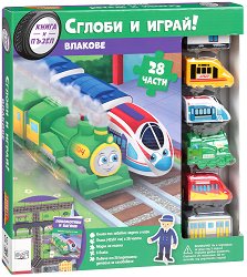 Подредете пъзела с 28 части и ще получите жп гара за игра с размери 42 x 61 cm. Вече може да играете с вашите 6 влака. Издърпайте влака назад и го пуснете - той ще тръгне напред! Извадете детайлите от картоненото приложение и сглобете човешки фигури, дървета, пейки, знаци, с които може да оживите гарата. В книгата ще намерите забавни тематични задачи и игри - лабиринти, намира не на разлики и липсващи детайли, рисуване и много други. Комплектът съдържа: книга със забавни тематични задачи и игри; пъзел с 28 части; модел на пъзела; 6 влака; повече от 25 картонени детайла за сглобяване. Книжката е от 32 страници и ... |