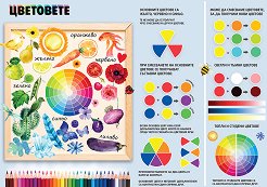 Таблото е с размери 70 x 100 cm. Таблото съдържа информация за: основните цветове; смесване на основни цветове; светли и тъмни цветове; топли и студени цветове. ... |