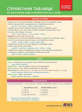 В таблиците е представено най-важното от учебното съдържание по български език и литература за 3. клас: правопис на гласни и съгласни звукове; части на думата - корен, представка; сродни думи; части на речта - лице на глагола; спомагателен глагол съм; степенуване на прилагателно име; значение на думата; синоними; видове изречения според целта на изказване - възклицателно и подбудително; правила за писане на съчинение и преразказ; редактиране на текст; литературни понятия - епитет, сравнение, художествено описание, повествование, пословица. Помагалото може да се използва с всички одобрени учебници. ... |