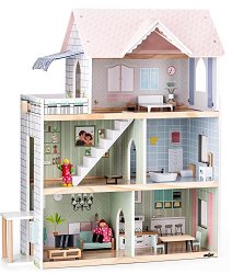 Дървената къща ще бъде прекрасен дом за куклите на вашето дете. Тя разполага с 3 етажа и има тераса. На първия етаж са разположени кухня и баня. Вторият етаж разполага с музикална стая и хол. На третия етаж се намира спалнята. Мебелите, които са включени в комплекта, са столове, кухненска маса, вана, тоалетна, диван, маса, пиано, стол за пиано, легло, нощно шкафче и растение. Къщата е декорирана в прасковен и светлозелен цвят. Децата могат да разиграват ролеви игри като научат куклите си да свирят на пиано или се погрижат за тях като ги приготвят за сън. Дайте им шанс да развият своето въображение и да се забавляват. ... |