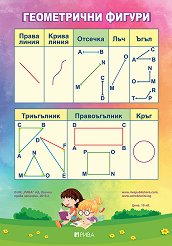 Таблото е с размери 70 x 100 cm. Таблото съдържа информация за: права линия; крива линия; отсечка; лъч; ъгъл; триъгълник; правоъгълник; кръг. ...