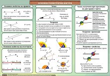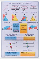 Учебното табло "Основни геометрични фигури" е ламинирано, с лайсни и въже за закачане. Таблото е с размери 70 x 100 cm. На него е показана аналогията при отсечка и ъгъл за сбор, разлика и среда (ъглополовяща). Онагледени са съседните и противоположни ъгли и теоремите за тях, а също и ъглите получени при пресичане на две прави с трета. Показани са теоремите, признаците и свойствата при успоредни прави. ...