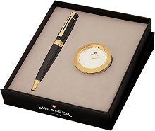 Комплектът на Sheaffer е чудесен подарък за близък приятел или бизнес партньор. Той се състои от химикалка и настолен часовник. Химикалката от колекцията 300 е прецизен и стилен аксесоар с елегантна линия и балансирано тяло, гарантиращи дълготрайност, качество и удоволствие при писане. Тялото и капачката ѝ са изработени от метал с лакирано покритие. Химикалката предлага добър захват и оставя гладка линия в черен цвят на листа. Тя предлага възможност за многократно презареждане с пълнители K Style на производителя. Химикалката е снабдена с фин клипс, чрез който може да се захване за тефтер или за джоба ви. ... |