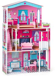 Къщата за кукли от WoodyLand ще бъде чудесно допълнение към интериора в детската стая и ще създаде уютно място за ролеви игри. Тази нежна розова къща с три етажа включва различни зони за игра: кухня и баня на първия етаж, всекидневна на втория и спалня с тераса на третия. В комплекта са включени основни мебели като легло, диван, масичка, кухненска маса и столове, както и вана. Чрез играта с къщата децата ще могат да развиват въображението, фината си моторика и креативното мислене, докато измислят и пресъздават истории. Важно! Куклите за игра показани на допълнителните снимки ще можете да закупите отделно. ...