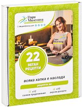 Комплект от 22 карти с 22 веган рецепти. Картите са разпределени в 2 теми - 12 солени предложения и 10 вкусни десерта. Всяка рецепта се приготвя много бързо и лесно. Рецептите са подходящи: за хора, които изцяло са изключили животинските продукти от менюто си; за хора, които искат да намалят животинските продукти в своето ежедневие; за цялото семейство; за хора, които искат да поддържат своята добра форма; за всеки, който иска да разнообрази своето меню. Картите имат за цел да помогнат на човек да изгради правилни хранителни навици. С тяхна помощ човек може лесно да следи своя дневен калориен прием и да влиза ... |