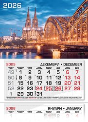 Характеристики на календара: 3 тела от 12 листа - на всеки лист по 1 месец (основен, предходен и предстоящ месец); фази на луната; имени дни; църковни празници; официални празници; съкращения на държавите, които честват свой празник на дадената дата; прозорче с ластици. ... |