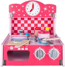 Детската дървена кухня от "Klein" ще предложи на малчуганите часове забавление в играта на готвачи. Изработена е така, че да прилича на истинска и има фурна с отваряща се врата и метална решетка. Над нея има имитация на вграден керамичен плот - котлоните са изобразени в червено. Копчетата за "включване" на печката могат да се въртят. Кухнята разполага и с мивка - изработена от метал, а кранчетата и батерията са от дърво. По рафтовете могат да се подредят различни хранителни продукти и кухненски уреди. Комплектът за игра е изработен от дърво и е с приблизителни размери 55 / 72 / 30 cm. ... |
