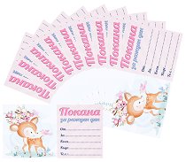 Комплектът се състои от 10 покани подходящи за рожден ден на момиче. На тях могат да се изпишат името на рожденика, за кого е поканата, датата, часът и мястото на събитието, както и телефонен номер за връзка. Всяка от поканите е с размери 11.5 x 7.5 cm. ...