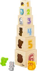 Кубчетата от Viga Toys са изработени от дърво. Те са декорирани с цифри от една страна, а от другата страна разполага с фигури във формата на животни. Освен това имат и прозрачен елемент, оцветен в ярък цвят. Елементите могат да се вадят от кубчетата и да се играе с тях самостоятелно. Малчуганите могат да подреждат блокчетата като пирамида. Така те ще развият логическото си мислене и ще се научат да разпознават животните и цифрите. Кубчетата могат да се прибират едно в друго, а по този начин не заемат много място в детската стая. ... |