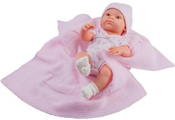 Момиченцето е част от серията "Mini Pikolines", където можете да намерите още реалистични и детайлни кукли бебета в комплект с различни аксесоари. ... Куклата от испанския производител "Paola Reina" е изработена от материали с най-високо качество, и е сглобена и декорирана на ръка. Изработена е от мека пластмаса - винил, без съдържание на фталати, а фините детайли правят куклата да прилича на истинско бебе. Облечена е с бяло боди на розови шарки, обута е с бели къси чорапи, на главата си има плетена шапка и е в комплект с плетено розово одеяло. Куклата е с височина 32 cm, ръцете и краката ѝ ... |