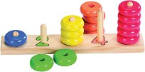Дървената играчка за нанизване се състои от основа с оси за поставяне на елементи с различни цветове. Осите са с различна височина, като под всяка има изписана цифра показваща колко на брой елемента могат да бъдат нанизани на нея. За по-голямо удобство на децата които тепърва се сблъскват с броенето, всеки елемент е боядисан в същия цвят като цифрата изписана на основата. В комплекта има една основа и петнадесет елемента в следните бройки и цветове: за цифрата 1 има един елемент - цвят син за цифрата 2 има два елемента - цвят зелен за цифрата 3 има три елемента - цвят жълт за цифрата 4 има четири елемента - цвят ... |