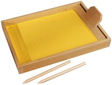 Този комплект е разработен по образователния метод на Монтесори. Подходящ е за деца над 3-годишна възраст. Състои се от дъска, 2 писалки, аксесоар за изглаждане и цветен пясък. Елементите са изработени от дърво и са с размери, съобразени с малките детски ръчички. Целта на този интересен комплект е децата да се научат да рисуват и пишат върху пясък. Това простичко действие ще развива детската координация и въображение, и ще развива силата в захвата на детските ръчички. Дъската за писане е с размери 25 / 35 / 4 cm. За метода на Монтесори Революционен образователен метод - така би звучало най-краткото обяснения на ... |