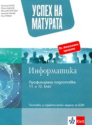 Профилирана подготовка за 11. и 12. клас. ... Помагалото от поредицата Успех на матурата на издателство Клет България предоставя отлична възможност подготовка за втория задължителен зрелостен изпит по информатика след профилирано обучение в 11. и 12. клас. Изданието е създадено в съответствие с учебно-изпитната програма по информатика и в допълнение на учебниците и учебните помагала за 11. и 12. клас на издателство Клет България. Изданието включва: тренировъчни въпроси и задачи за текуща подготовка по всички модули за профилирана подготовка в 11. и 12. клас; тестове задачи по формата на ДЗИ, определен в ... |