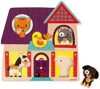 Детският музикален пъзел от Janod ще помогне на децата да се научат да разпознават животните. Пъзелът има звуков ефект, така когато някое от животните бъде поставено на правилното му място, ще се чуе звукът, който то издава. Звуците включват тези на куче, птица, хамстер, котка и конче. На елементите има поставени дървени пинчета, които улесняват малчугана да ги хваща и поставя по-лесно в определените отвори. Дървеният пъзел разполага със система за включване и изключване на звука на гърба. Комплектът е изработен от дърво, а използваните бои са напълно безвредни и на водна основа. Играчката работи с 2 батерии AAA, ...