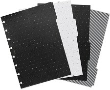 Разделителите от серията Moonlight на Filofax са създадени, така че да ги добавяте, местите или премахвате, без да се налага да ги късате. Към перфорацията, предвидена за спиралата са добавени допълнителни прорези, които държат стабилно всяка страница и позволяват без особени усилия да извадите 1 или повече листа от съдържанието, както и да добавите такива. Разделителните индекси са изработени от пластмаса с шарки в златисти, черни и бели цветове, отпечатани от двете страни. Пластмасовите разделители са предназначени за използване с тефтери Filofax с формат A5. Предлагат се в опаковка от 4 броя. Характеристики: ... |