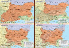 Характеристики на карта "България според Санстефанския мирен договор - 3 март 1878 г.": географска мрежа; територия на Княжество България според Санстефанския прелиминарен договор и съседни държави, представени чрез фоново оцветяване върху сенкорелеф; държавни граници и граница на автономно княжество според договора; столици и градове; хидрография и надписи на хидрография, държави, историко-географски области; легенда. Характеристики на карта "България според Берлинския договор - 1 - 13 юли 1878 г.": географска мрежа; територия на Княжество България, Източна Румелия и съседни държави, ... |