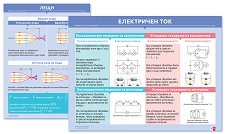 Комплектът включва 2 табла за фронтална работа по физика и астрономия за 7. клас на тема Лещи и Електричен ток. Първото представя темата Лещи като разглежда начините за построяване на образ на предмет от събирателна леща, видовете лещи и формулите за изчисляване на оптичната им сила. Второто запознава учениците темата Електричен ток като в табличен вид представя всички означения, формули и мерни единици. Другата му страна съпоставя успоредното и последователното свързване на консуматори и източници в електрическа верига. Таблата са с размери 63 x 84 cm. ...