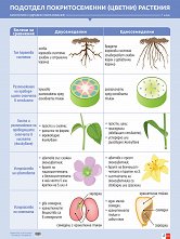 Двустранно учебно табло за фронтална работа по биология и здравно образование за 7. клас. Едната страна на таблото разглежда Подотдел покритосеменни (цветни) растения. По различни белези за сравнение са разгледани двусемеделните и едносемеделните растения. Другата страна на таблото запознава учениците с темата Цвят. Разгледано е устройството на двуполов цвят със сложен околоцветник, също и видовете съцветия при цветните растения. Таблото е с размер 63 x 84 cm. ...