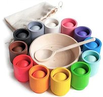 Комплектът е подходящ за деца над 3-годишна възраст. Той се състои от купа, лъжица, торбичка, 12 цветни чашки и 12 цветни топчета за сортиране. Изсипете всички цветни топчета в купата. Задачата на малчуганът ще бъде с помощта на лъжицата да сортира всички цветни топчета в съответстващите по цвят чашки. Това простичко действие има за цел да развива детското цветоусещане, координация и концентрация. Елементите са изработени от дърво, боядисано с безвредни бои на водна основа, а размерите им са съобразени с малките детски ръчички. За метода на Монтесори Революционен образователен метод - така би звучало най-краткото ...