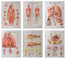 Комплектът от 6 табла включва: органи в човешкото тяло; дихателна система; анатомия на сърцето; мускулна система; риба; жаба. Таблата са релефни с размери 53.5 x 73.5 cm всяко. Изработени са от PVC и имат възможност за монтиране в рамка. Съдържат богата информация на български език. ... |