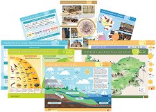 Комплектът от 8 двустранни дидактични табла за фронтална работа включва: табло по български език и литература - Главни части на изречението. Време на глагола; табло по математика - Геометрични фигури и тела. Обиколка лице. Мерни единици; табло по човекът и обществото - Културни и исторически обекти. Резервати в България; табло по човекът и природата - Хранене и дишане при човека. Групи животни; табло по човекът и природата - Кръговратът на водата. Слънчевата система; табло по изобразително изкуство - Паметници на културата. Митологични образи; табло по музика - Музикален речник. Музикални инструменти, оркестри; ... |