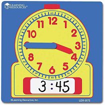 Нарисуван механичен часовник от "Learning Resources". Към циферблата му са прикрепени две стрелки от тънка пластмаса, които могат да се местят с пръст независимо една от друга. В долната част на картончето има правоъгълно пространство, разделено със знака "две точки", което е предназначено за изписване на часа и минутите с цифри. За целта може да се използва маркер за бяла дъска или други маркери на водна основа. Написаното се почиства с леко влажна мека кърпа или специална гъба. Играчката е предназначен за деца от предучилищна и ранна училищна възраст. Тя помага на децата да се научат да познават ... |