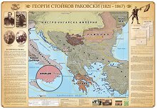 Картата проследява житейският и революционен път на Георги Раковски. Тя съдържа хронология на живота му, пет негови снимки и гравюри, информация за неговите идеи, основните му издания и други интересни детайли. Картата отразява и политическите граници към 1867 г. Характеристики: размери: 98 x 68 cm; без лайсни; без приспособления за закачане на стена; материал: гланцирана хартия, без ламинат. ...