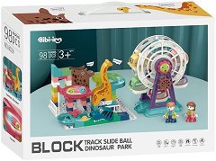 Създайте забавен увеселителен парк с интересен дизайн на динозаври. Конструкторът се състои от 98 пластмасови елемента за сглобяване на увеселителен парк с атракции. Сглобете частите и се забавлявайте с виенското колело, което се движи чрез завъртане с ръка. По пързалката с препятствия се състезавайте като пуснете 3 малки топчета от комплекта. Кое ли първо ще се справи с всички препятствия? В комплекта са включени 2 мини фигури на човечета, с които играта да бъде още по-вълнуваща. Играта с комплекта ще помогне на детето да развие своето въображение и фина моторика. ...