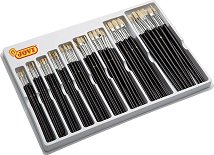 Четките от "Jovi" имат висококачествена дървена дръжка, лакирана със защитен лак и естествен косъм от свинска четина. Те са подходящи за рисване с темперни, акрилни, маслени и текстилни бои. Комплектът съдържа 108 броя плоски четки с различен размер от №0 до №16. Той е подходящ за училищни или развлекателни дейности и ще осигури часове творческо забавление за малки и големи. С него децата ще имат безкрайни възможности за рисуване и развиване на креативността си. ... |