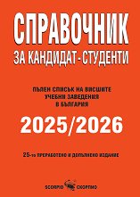 25 -то преработено и допълнено издание. ... Пълен списък на висшите учебни заведения в България. Справочникът за кандидат-студенти 2025 / 2026 е изключително ценно издание, защото ви дава актуална информация относно вашето кандидатстване във всички държавни и частни университети на територията на България. Данните са подбрани от справочниците на отделните ВУЗ-ове. Университетите си запазват правото да въвеждат частични промени в специалностите и бройките."Успех, кандидат-студенти! Ние всички сме минали по този път и не забравяйте: Корените на учението са горчиви, но плодовете сладки." От авторите ... |